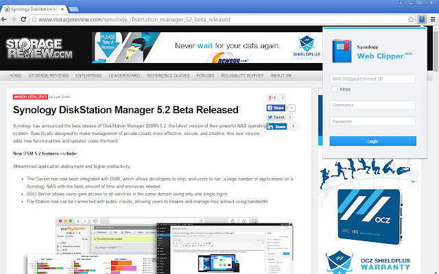 Synology Web Clipper 可将网页内容保存到 Synology NAS 以进行快速方便地访问。可保存文字、图片和链接的完整页面。