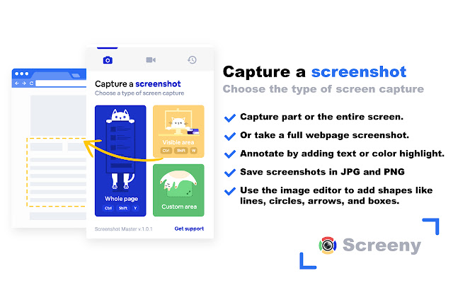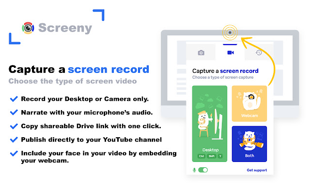 Screeny非常易于使用,您不再需要多个扩展名即可录制视频或共享屏幕截图。弹出菜单使您可以轻松地在屏幕录制和屏幕捕获之间切换。只需选择您所需要的!