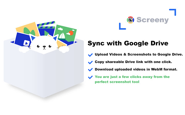 使用功能强大的屏幕捕获和屏幕录制工具Screeny捕获屏幕。将屏幕录像和屏幕截图保存到Google云端硬盘,并通过独特的共享链接立即共享您的视频和图像。