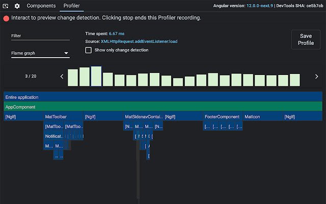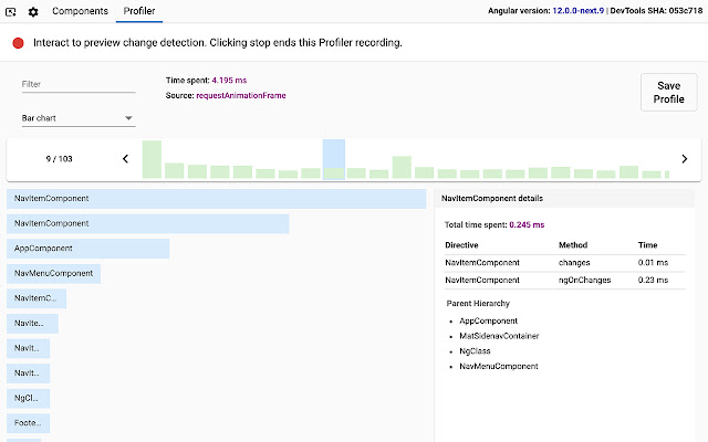 您可以使用 Angular DevTools 来了解应用程序的结构并查看指令和组件实例的状态。要深入了解应用程序的执行情况,您可以使用分析器选项卡,该选项卡会显示各个更改检测周期、触发它们的原因以及 Angular 在其中花费的时间。