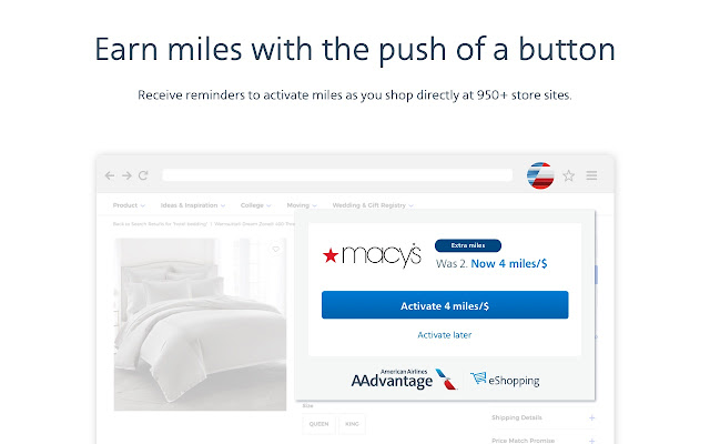 当您在线购物以获得航空公司奖励时,该按钮将让您知道何时激活并以每美元无缝赚取里程。
