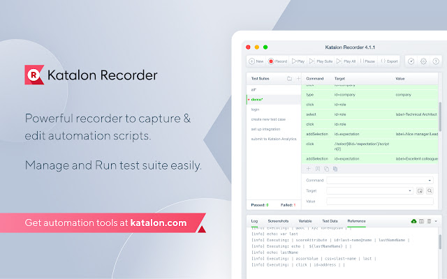 Katalon Recorder 是用于在 Chrome、Firefox 和 Edge 上进行录制和播放的最 UI 友好和最简单的扩展。作为日常驱动网络记录器的完美 Selenium IDE 替代品。