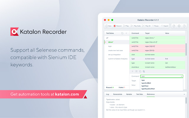 与 Selenium IDE 不同,Katalon Recorder 的录制功能在主要网络浏览器上非常强大:Chrome、Firefox 和 IE。这个扩展是 Katalon Studio Hackathons 比赛的冠军项目。 Katalon 自动化记录器的开发是为了支持那些不再能够使用老式 Selenium IDE 来记录和回放自动化测试的用户,或者是流行的开源框架的用户正在寻找一个方便的记录器。 Katalon Recorder 可以与其他 Katalon 解决方案(Katalon Studio 和 Katalon TestOps)集成,以满足高级测试生成、报告和测试编排需求。