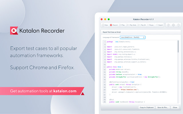 - 以各种格式和框架导出 Selenium WebDriver 脚本。