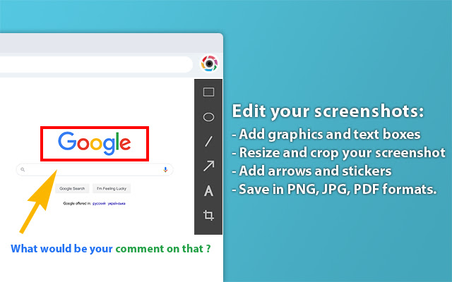 Screenshot your way through the web with this easy to use extension. Capture all or part of a web page to save or to share with co-workers, friends, or family. Our easy to use editing tool allows you to mark up the image before sending if you want to highlight certain areas and/or blackout others. Works great on all platforms!