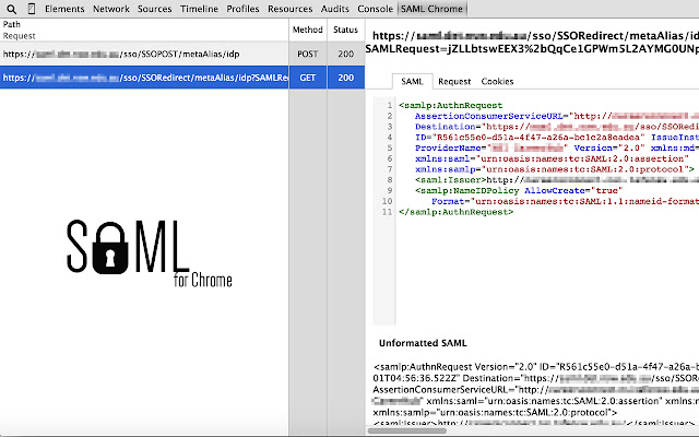 这是 Chrome 的开源 SAML 调试器。它作为 Chrome 开发人员工具部分中的另一个面板运行,用于监控当前活动选项卡中的流量。该面板试图复制 Firefox 版本的 SAML Tracer 所做的事情,因为在撰写本文时,Chrome 还没有足够好的(或任何)版本。