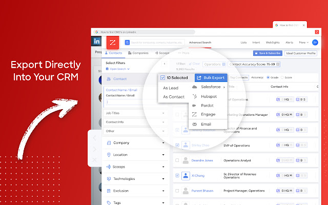 不再需要手动输入数据。将您的搜索导出到 Salesforce、Outreach、Hubspot、Pardot、ZoomInfo Engage、电子邮件等!