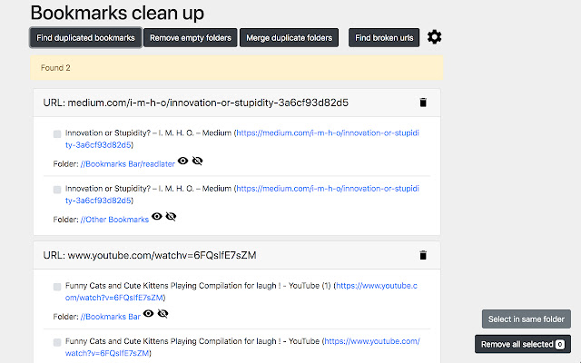 此扩展允许查找和删除重复的书签、空文件夹、合并同名文件夹(在同一路径内)、查找不再工作和过期的书签并轻松删除它们。