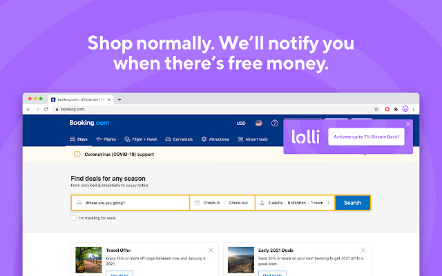 我们为您创造了最简单的方式,让您在日常购物中赚取高达 30% 的比特币或现金返还。浏览我们的精选商家列表或在您到达商家网站时利用我们的浏览器通知,您将永远不会错过为您的所有在线购物赚取免费比特币的机会。 Lolli 会在您购物或预订旅行之前提醒您,这样您就不会错过奖励。让 Lolli 成为您进入比特币的入口!