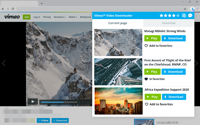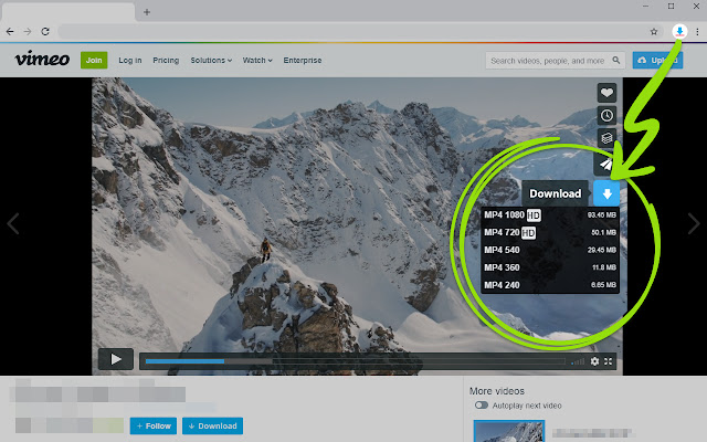 Vimeo 下载器在视频页面、视频列表或嵌入视频中添加了“下载”按钮。单击“下载”按钮并选择您要下载的视频的质量。您还可以创建收藏夹列表并直接在浏览器中进行管理。