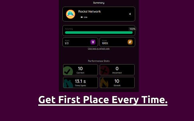 Rocks Network psents:官方 Quizizz Rocks 答案浏览器。只需安装此 chrome 扩展程序,当您加入测验时,只需单击图标即可在格式精美的 UI 中获得答案。它适用于任何测验游戏,无论是测验/家庭作业/测试。如果出现任何问题,您可以通过 https://rocks.network/discord 或通过电子邮件contact@rocks.network 联系我们非常活跃的支持团队。类似的作弊也可以通过 https://quizizz.rocks/ 上的游戏别针访问。