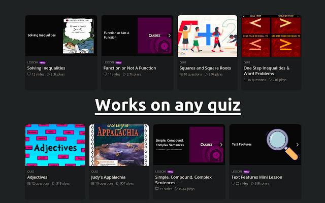 Quizizz 是一家创意软件公司,用于课堂、小组作业、p-test 复习、考试、单元测试和即兴测试。它允许学生和教师同时在线。它采用测验式的教学方法,用户独立回答一系列问题,并在同一个测验中与其他用户竞争。
