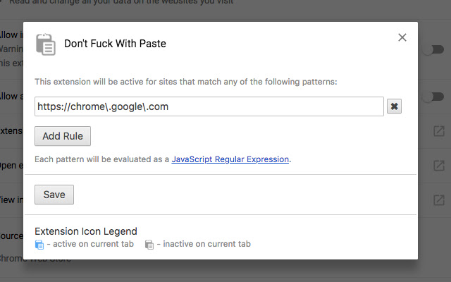 此扩展程序不会尝试阻止站点干扰与这些浏览器操作(control-v、command-v 等)相关的键盘快捷键,也不会阻止站点干扰“contextmenu”事件(右键单击菜单)。对于那些干扰键盘快捷键和上下文菜单的超级烦人的站点,可能需要使用浏览器菜单中的“编辑”->“粘贴”。