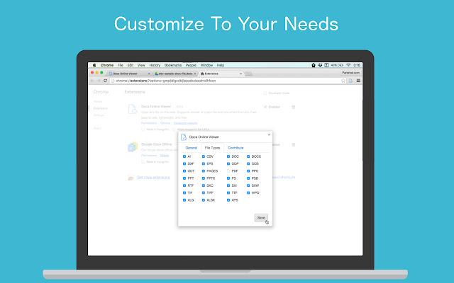 它使用第三方在线服务,如 Google docs API(或其他可用服务)在浏览器中打开扩展名为 PDF、DOC、DOCX、XLS、PPT、RTF、ODT、ODS、ODP、CSV 和更多文件格式的链接无需在您的计算机上安装任何第三方软件。