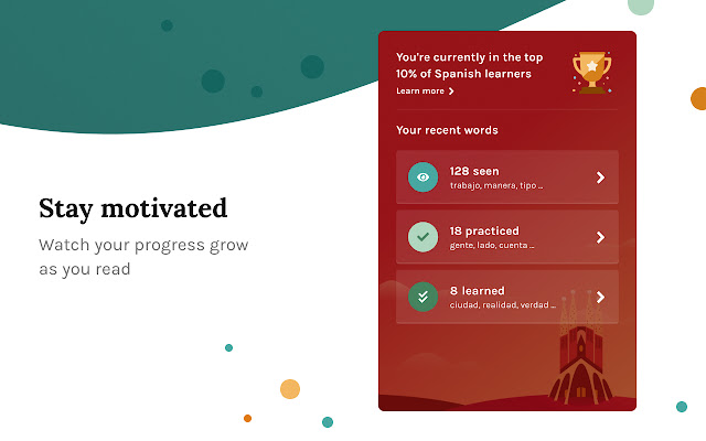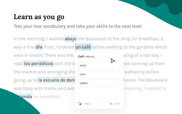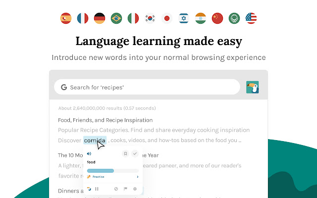 ➤ 当您访问网站时,Toucan 会自动将页面上的某些单词和短语翻译成您希望学习的语言。通过这种方式,您就可以在自己熟悉语言的语境中,学习新语言中的单词。