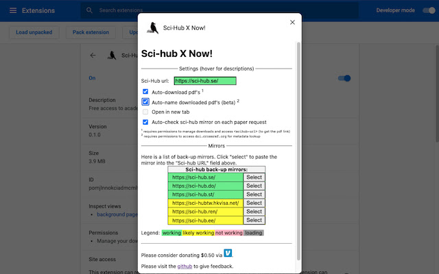 允许您在“首选项”/“选项”中更改 sci-hub 域,以防 sci-hub 镜像发生变化。每次单击扩展程序时,扩展程序都会自动检查服务器是否关闭,如果是,则将您定向到选项页面以更改域。