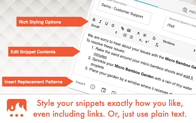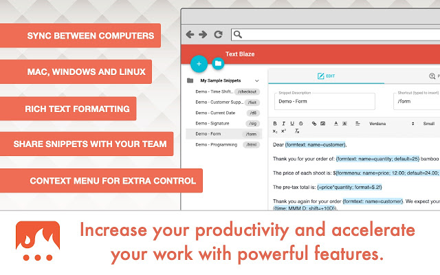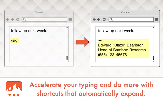 节省时间并完成更多工作!保存文本片段和模板,并使用键盘快捷键将它们插入网络上的任何位置。