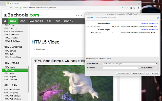 Easy Video Downloader 支持默认禁用的“中断”,可以使用工具栏按钮菜单上的右键单击菜单项启用。如果启用了“中断”,则在即将下载文件时会弹出扩展名。使用 UI,您可以使用外部下载管理器请求下载或复制实际的可下载链接。
