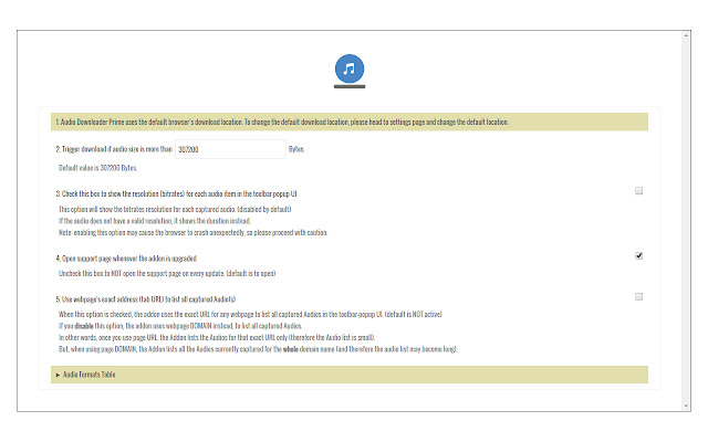 3. 您可以从选项页面添加、删除或禁用音频格式。