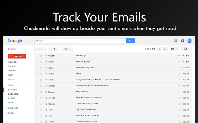 查看您的电子邮件是否已被阅读。只需安装即可自动跟踪任何未来的电子邮件。当在发送的电子邮件上启用跟踪时,会出现一个圆圈,阅读后会出现一个复选标记。适用于无限制的电子邮件帐户和发送的电子邮件。