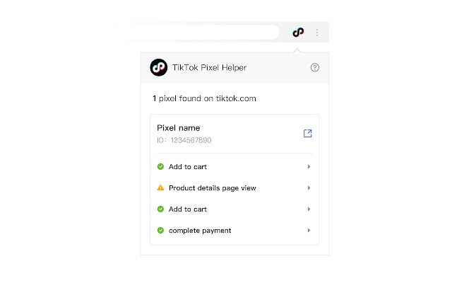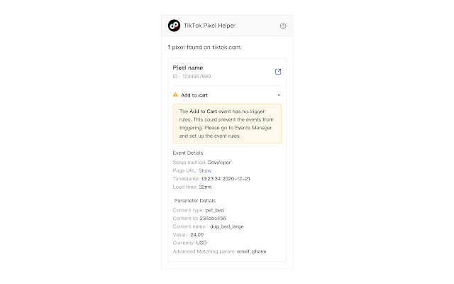 截至 2021 年 4 月,我们推出了新的改进版 TikTok Pixel Helper 2.0。使用 TikTok Pixel Helper 2.0,您可以通过像素、事件以及某些情况下的参数级实现的详细诊断,更深入地排除像素安装故障。通过直接访问相关说明指南,快速解决常见问题。