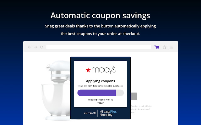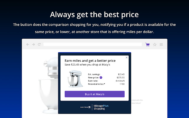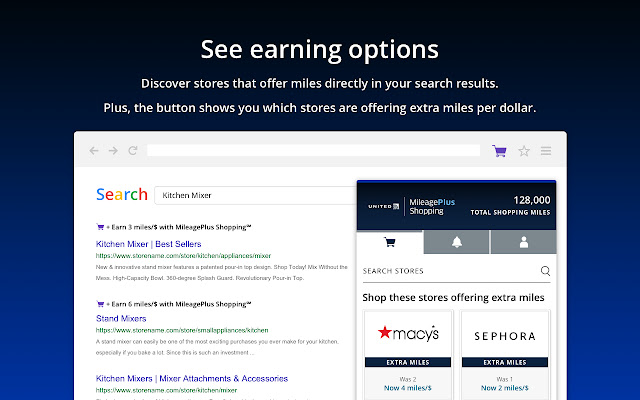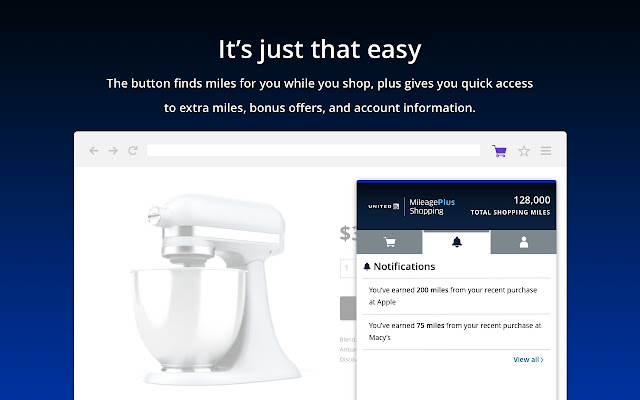 再也不会错过里程。安装前程万里 (MileagePlus®) 购物按钮,一键即可直接在 850 多个商店站点赚取里程。