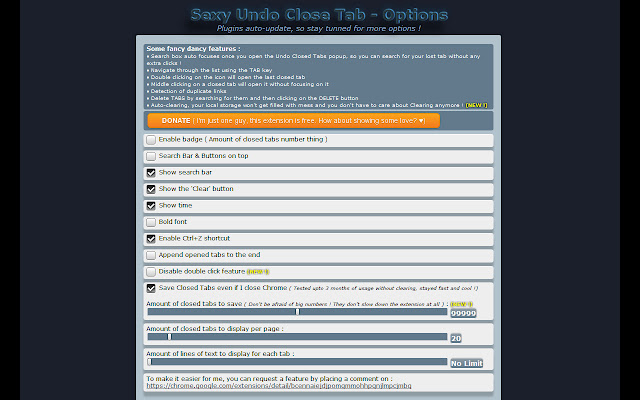 这东西就像一个迷你历史管理器,启用保存关闭的标签功能,它会保存那些关闭的标签!想要取回您上个月打开的标签吗?没问题 !它还会在!