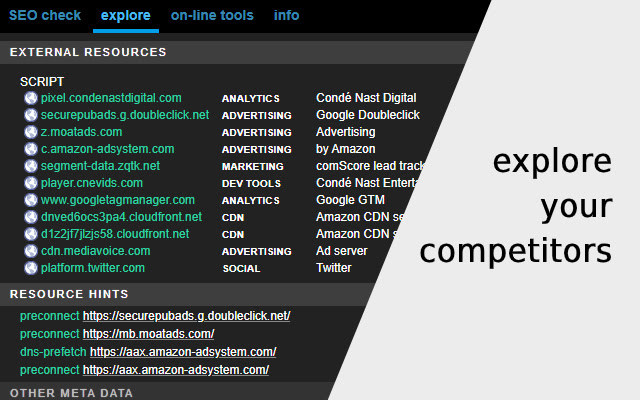 此扩展主要针对需要验证其网站的 HTML 以遵循网站管理员的 Google 指南的 Web 开发人员,但也适用于对通常不可见但可以揭示有趣的站点属性的任何页面内容感到好奇的人。