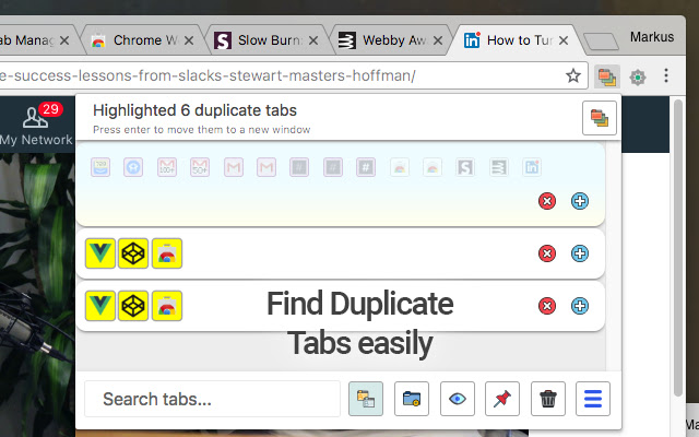 你被丢失的重复标签卡住了吗?只需 pss“重复选项卡”图标,选项卡管理器就会为您突出显示重复项。然后您也可以按“Enter”键,它们将被移动到一个单独的窗口。