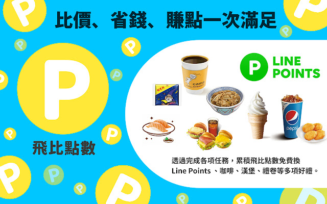 现在安装飞比购物帮手,即可获得飞比点数90点,可免费换Line points、超商购物金25元等多项好礼。