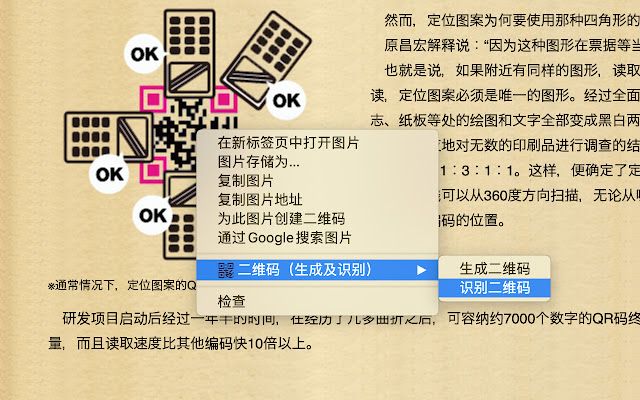 将当前页面地址、选中的文本或链接等生成二维码,也可以识别网页中的二维码图片(支持识别中文)。