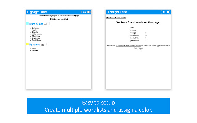 易于使用的 Chrome 扩展程序可自动搜索当前浏览器选项卡中定义的单词并将其标记为文本。通过设置可以获得更多高级功能: