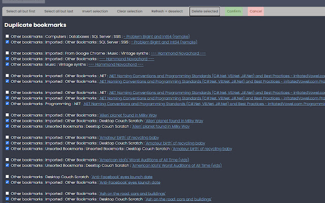 0.4.0 版引入了一项新功能:“立即查找所有重复项”按钮显示所有重复书签的列表,因此您可以选择要删除哪些书签。