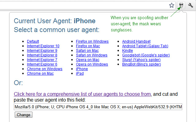 User-Agent Switcher 简单但功能强大。它添加了一个工具栏按钮,您可以使用该按钮在不同的常用用户代理字符串之间切换,或者您可以输入自己的。
