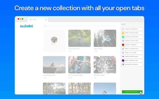 从新选项卡快速访问您的 Wakelet 集合。使用快捷功能保存所有打开的选项卡,或只需将您喜欢的链接拖放到集合中即可立即组织