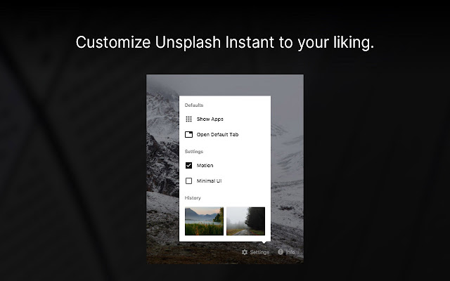 • 极简用户界面:隐藏部分用户界面,使 Unsplash Instant 变得更小