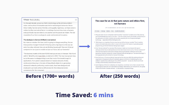 只需在您想要汇总的网页上点击 Chrome 工具栏中的“TL;DR”按钮,几秒钟内您就会在那里获得 <5 句摘要。