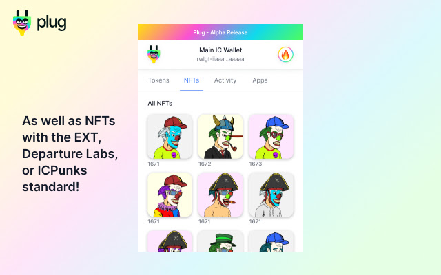 现在支持保存、查看和发送 IC NFT,包括 ICPunks、EXT NFT、Departure Labs、DIP721 标准等,这要归功于与 DAB 的 NFT 列表(HTML、视频或图像 NFT,在 Plug 内部交互!)的集成。以及具有DIP20和EXT令牌标准(包括WICP)的IC令牌,使用DAB的令牌列表!