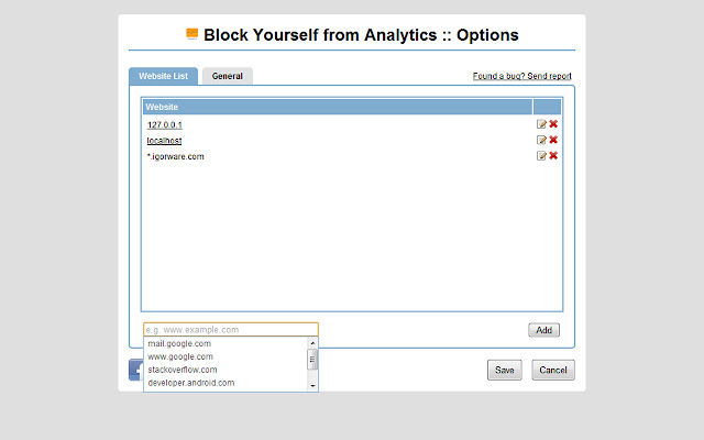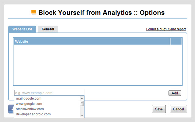易于管理的网站列表接受带有通配符的域名。这并不意味着阻止所有网站的 Google Analytics™ 脚本,我不支持,所以请不要要求此功能。