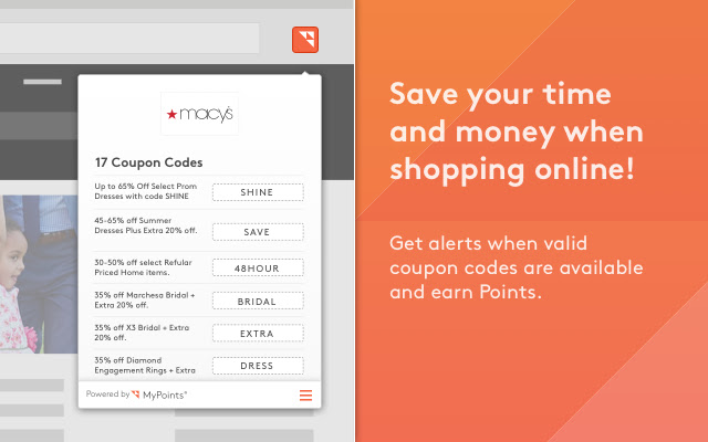 随着分数!浏览器扩展,MyPoints 会员不仅可以获得积分机会提醒,还可以获得优惠券代码!当您在线购物时,让我们为您找到折扣。
