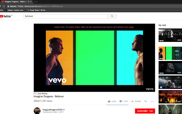 “仅音频 youtube” chrome 扩展使您可以仅禁用 youtube 上的视频,当您想在 youtube 上听歌曲时,这可以节省超过 50% 的互联网使用量。