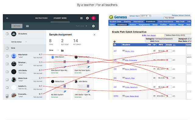有人会认为输入 Google Classroom 的成绩很容易转移到学区支持的成绩簿中,但事实并非如此。这给教育工作者留下了一个耗时的匹配练习,为每个学生、作业、评论和更新在一个站点上分配和评分,但仍然需要输入到“真实”成绩簿(Genesis、Infinite Campus、Aspen 、PowerTeacherPro 等)。我们的软件解决了这个问题,从而腾出时间,让教育工作者可以更多地关注他们的学生并创建引人入胜的课程,而不是无休止地滚动他们的班级名册,寻找在哪里输入成绩的名称。