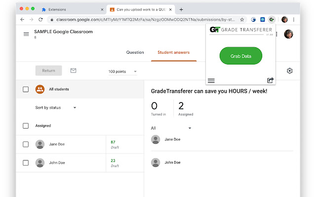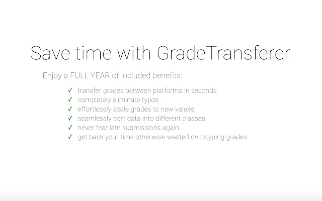 免责声明:虽然 GradeTransferer 旨在尽可能准确地获取和传输数据,但确保输入成绩的有效性仍然是用户(即教师)的责任; GradeTransferer 只是帮助加快流程的工具。它所使用的平台(即:GClassroom、Aleks、Schoology 等)的变化以及学生数据的变化可能会导致意想不到的结果。 GradeTransferer 显示抓取数据和填充数据的警报,以便用户可以检查正在传输的数据并进行更正/停止使用,并在必要时提交软件错误报告以解决问题。