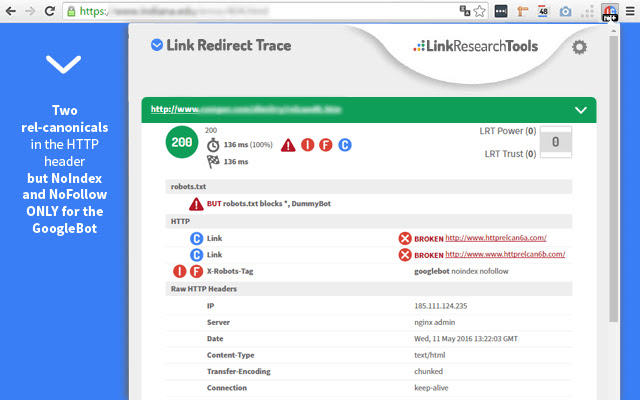 如果页面在 robots.txt 或 X-Robots-Tags 中被阻止,则立即查看跃点是否有 NOINDEX/NOFOLLOW 标签或其他技术问题,例如机器人特定的阻止。您还可以查看放置在每个重定向跃点上的所有 cookie。您可以查看每个链接和重定向页面的强度并分析“LRT Power*Trust”(Power like Google PageRank 和 Trust like“Trust Rank”对于每个重定向跃点。