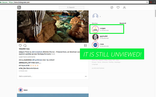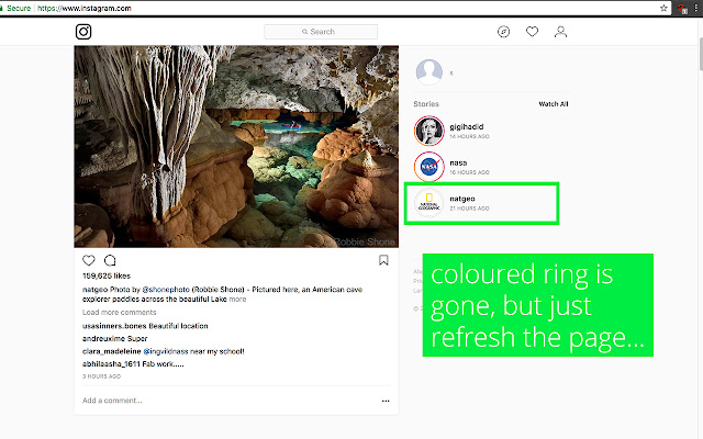启用 Hiddengram 后,继续查看您未曾看过的朋友(或任何人)的故事。 (一个看不见的故事在用户的个人资料照片周围有一个彩色环)。观看 Hiddengram 通过刷新页面来发挥它的魔力:您刚刚查看的故事仍被标记为看不见!