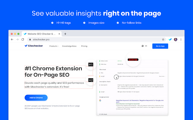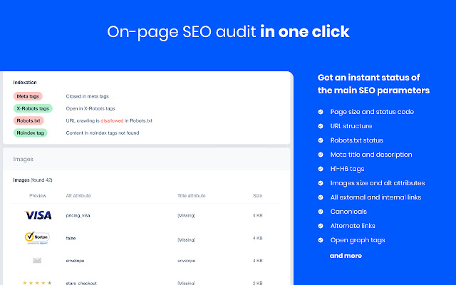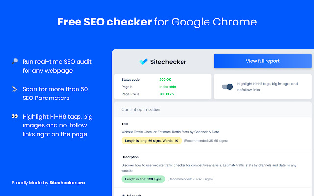 免费的 Sitechecker SEO Chrome 扩展程序可帮助您快速识别页面 SEO 技术问题。通过修复它们,您将提高排名并获得更多流量和销售额。