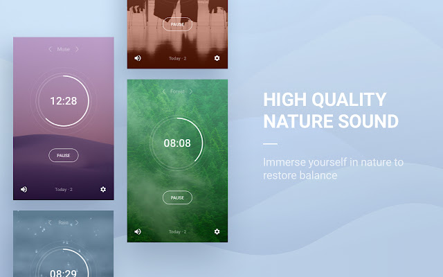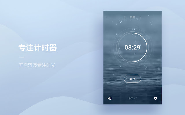 「潮汐」是一款基于自然声音的身心健康类产品。我们将海浪、雨天、森林等自然声音与专注计时器功能融合在一起,帮助你在使用电脑的过程保持专注,提升工作效率。