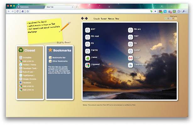 一个新的、可自定义的 Chrome 起始页。轻松找到您最喜欢的书签和关闭的标签。浏览时做笔记。