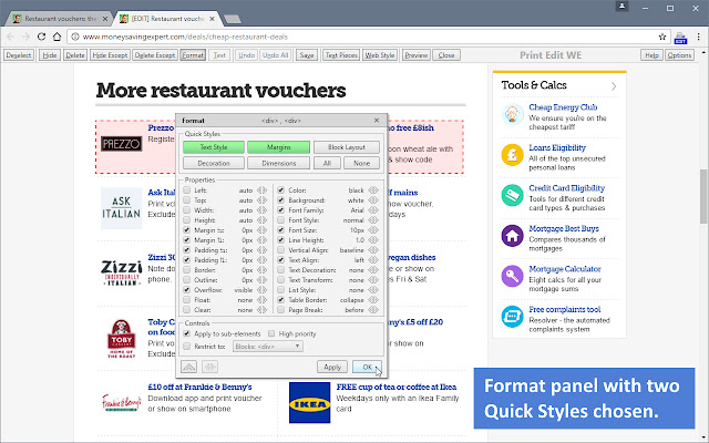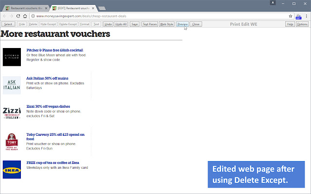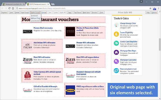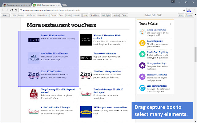 打印编辑 WE 提供了在打印或保存为 HTML 或 MHTML 之前编辑网页内容的工具。网页中的元素可以被格式化、隐藏或删除,并且文本可以被编辑或插入。可以轻松删除不需要的内容,例如广告和侧边栏。