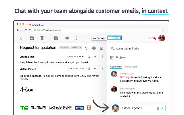 ➜ 每次电子邮件对话的实时聊天,与您的团队讨论客户需求和问题。在上下文中。实时!